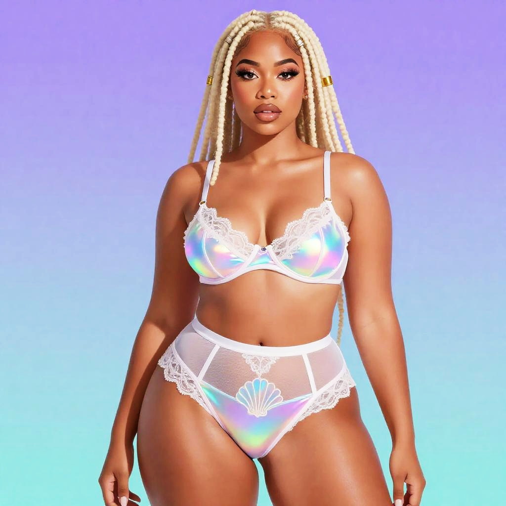 Image in the style of Afrofuturism editorial, Pacific Islander non-binary model, long ivory dreadlocks with gold cuff accents, full-figured athletic, lingerie strappy set, strappy holographic bralette, high-waist mesh panties with shell embroidery, bioluminescent ocean gradient with soft neon highlights studio background BREAK anime illustration modern pin-up style, vibrant gradient background, glossy skin rendering, high-contrast shading, delicate lace detailing, clean cel-shading, soft lighting, seductive and stylish aesthetic, bold character design, contemporary fashion-focused composition