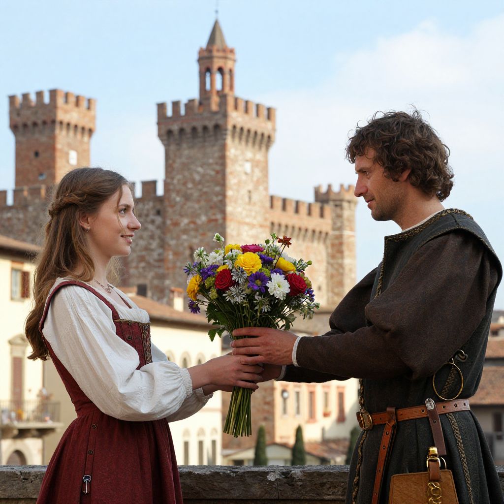 A man and woman exchange a bouquet of flowers in a medieval, Italian Renaissance city, with a castle in the background.