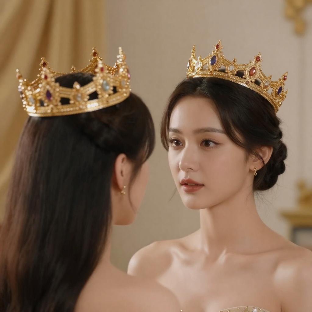Photograph of a woman with fair skin, dark hair in an updo, wearing a gold crown, looking at another person with long black hair and a larger, ornate crown. Both are indoors with gold and beige draped backgrounds.
