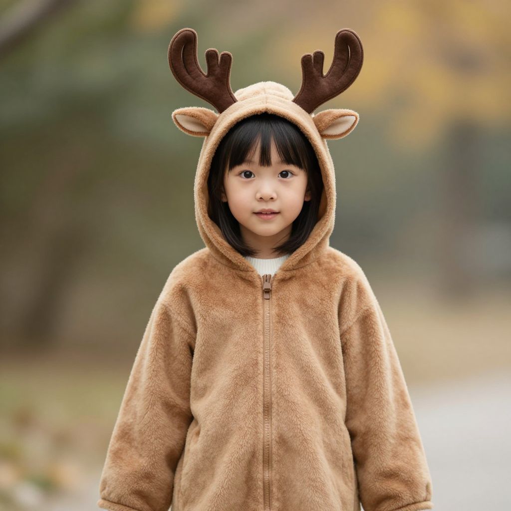 Photograph of an Asian child with straight black hair, wearing a tan deer onesie with brown antlers, standing outdoors in a blurred autumn background.