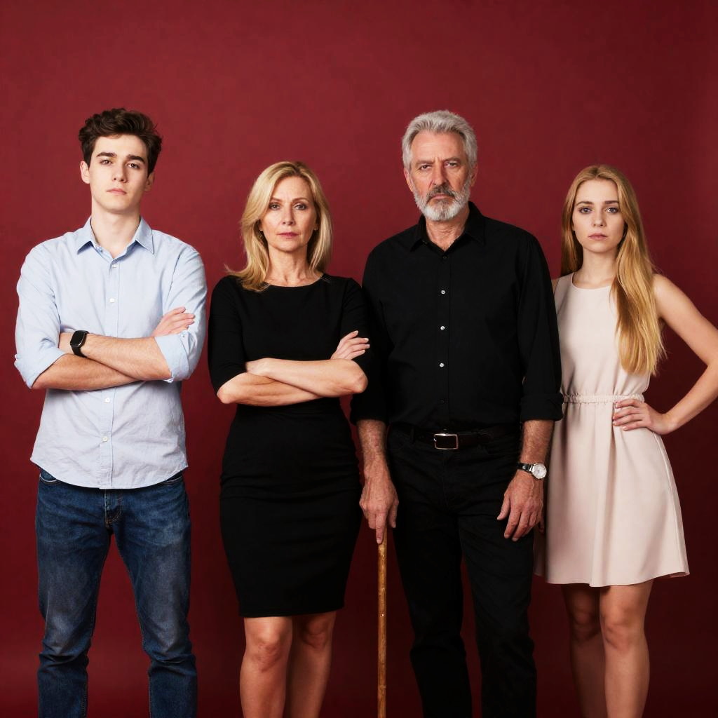 Photograph of four people standing against a red, ured background. From left to right: young man with dark hair, light shirt, and jeans, arms crossed; middle-aged woman with blonde hair, black dress, arms crossed; older man with gray hair, beard, black shirt, and black pants, holding a stick; young woman with long blonde hair, light dress, hands on hips. All expressions are serious.