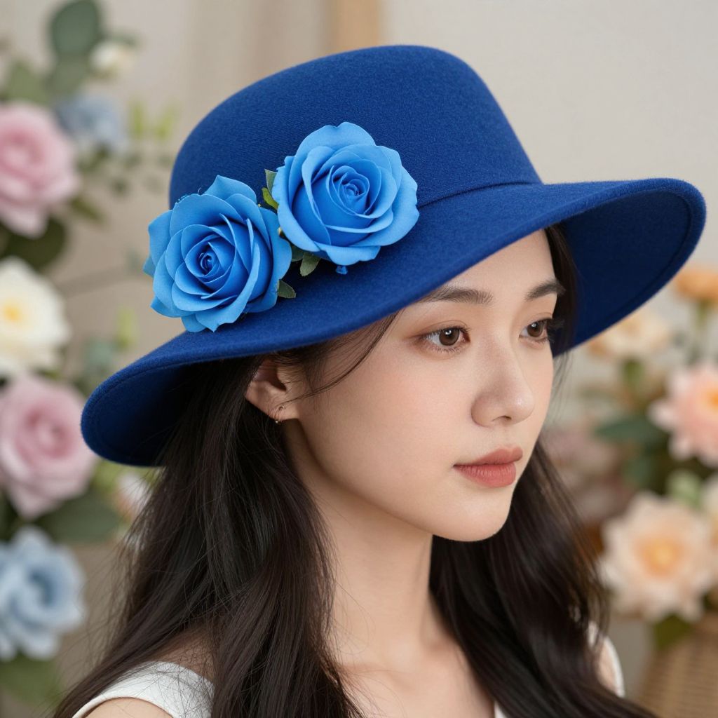 A woman in a blue hat adorned with blue roses, surrounded by a floral background.
