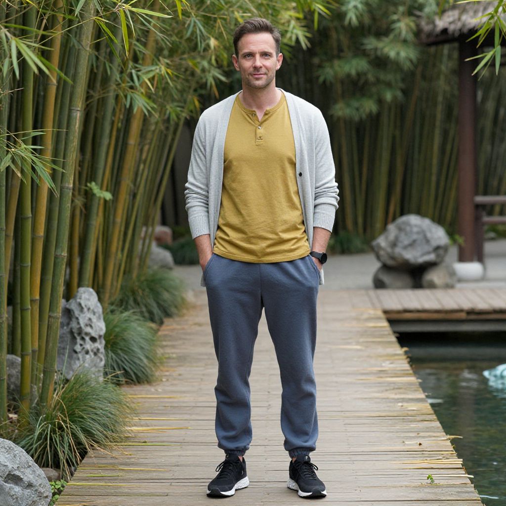 A man, hemp henley in muted mustard, recycled polyester sweatpants in slate blue, sporty trainers in black, unstructured cardigan in light gray, serene garden, bamboo pathways, soothing water features, cinecolor, relaxed expression, gentle smile. Man has masculine face and piercing eyes