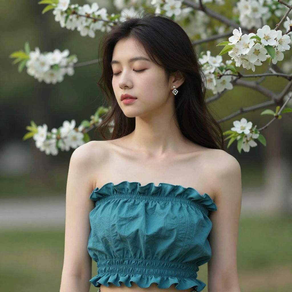 Portrait of a young Asian woman with long dark hair and delicate earrings, standing outdoors with eyes closed in a peaceful expression. She wears a teal ruffled strapless top and is surrounded by white blooming flowers and green foliage in a natural setting.