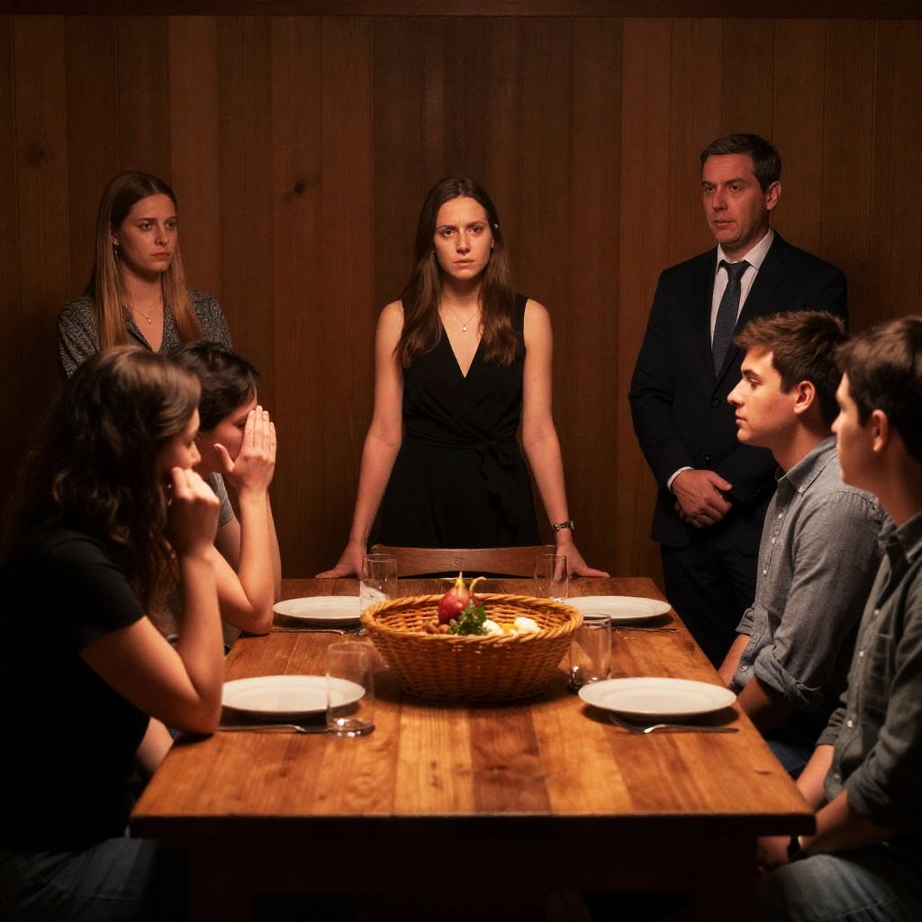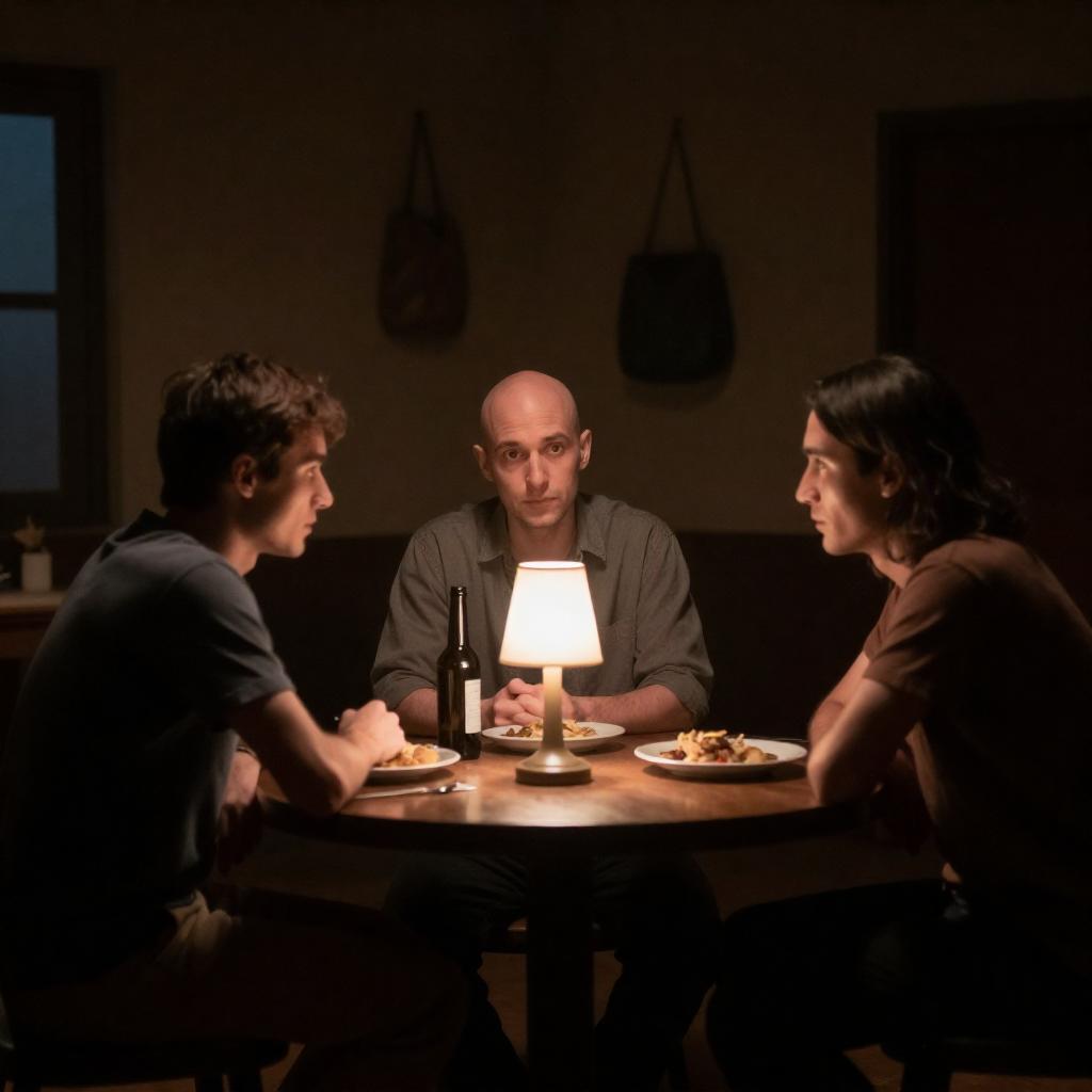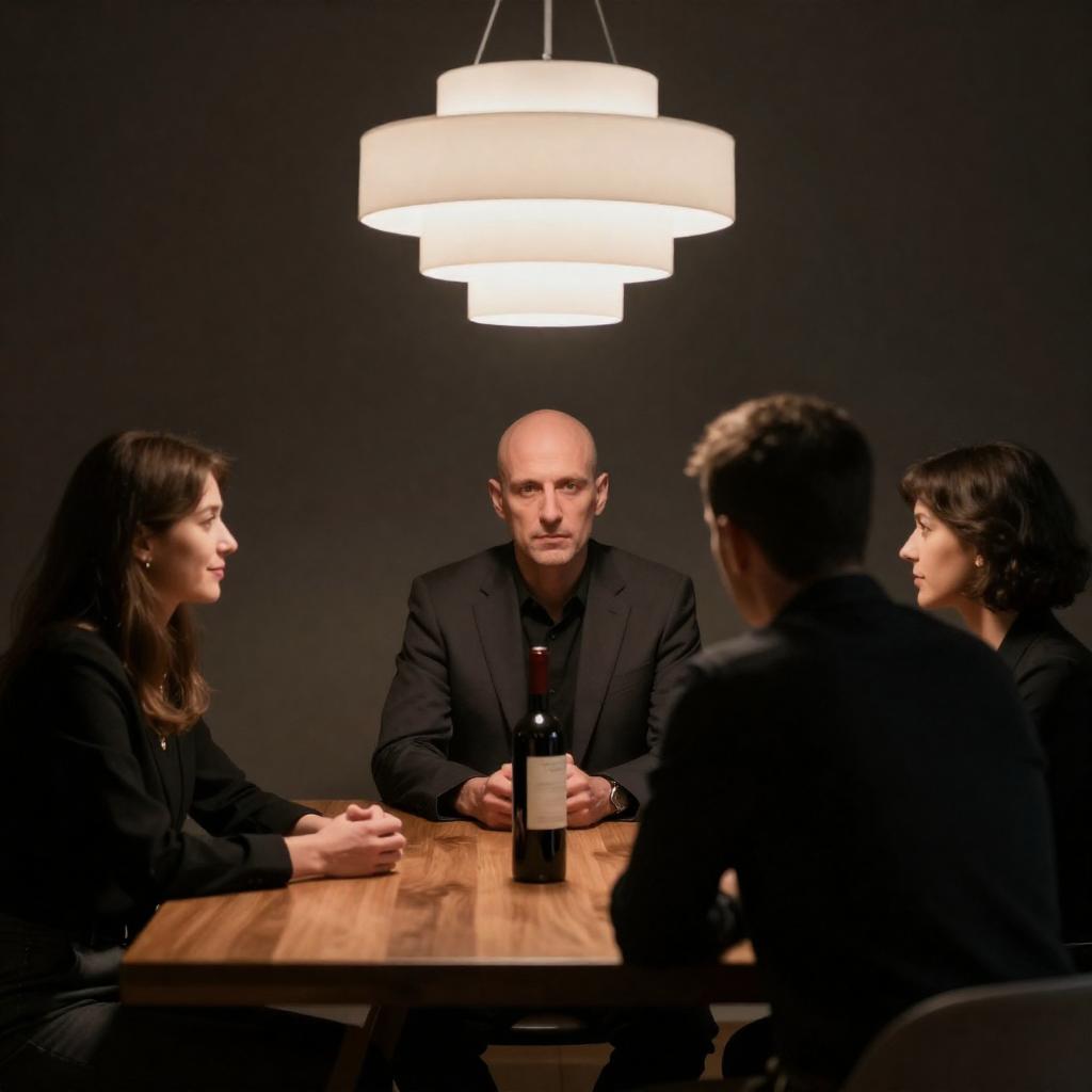 Photograph of four people sitting around a wooden table in a dimly lit room. Central chandelier with white, layered lights. Two men and two women, all in dark business attire. One man with bald head, serious expression, facing camera. Woman on left with long brown hair, smiling. Man on right with short hair, back to camera. Woman on far right with short brown hair, facing away. Dark, ured wall background. Bottle of red wine on table.