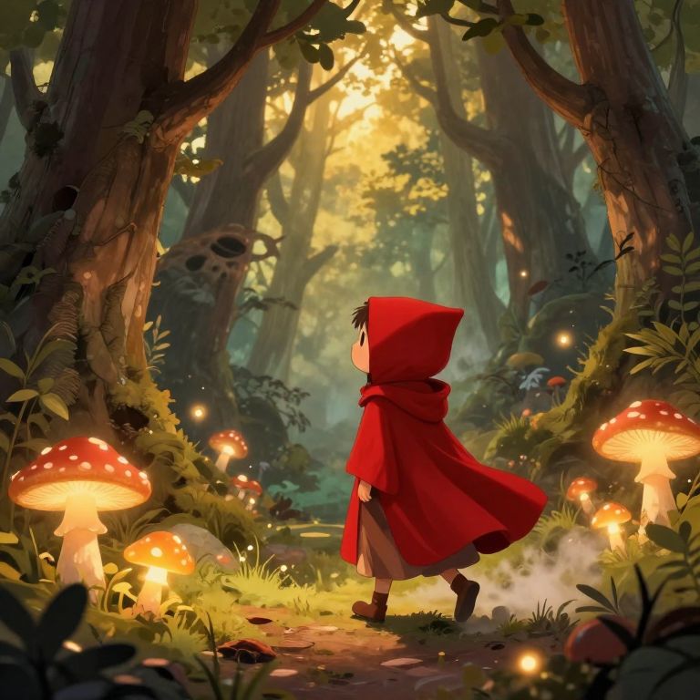 Caperucita wandering through an enchanted forest with glowing mushrooms and mysterious shadows, wearing a vibrant red hooded cloak, soft mist around her feet, detailed fairy tale illustration, warm golden light filtering through ancient trees, magical and whimsical atmosphere