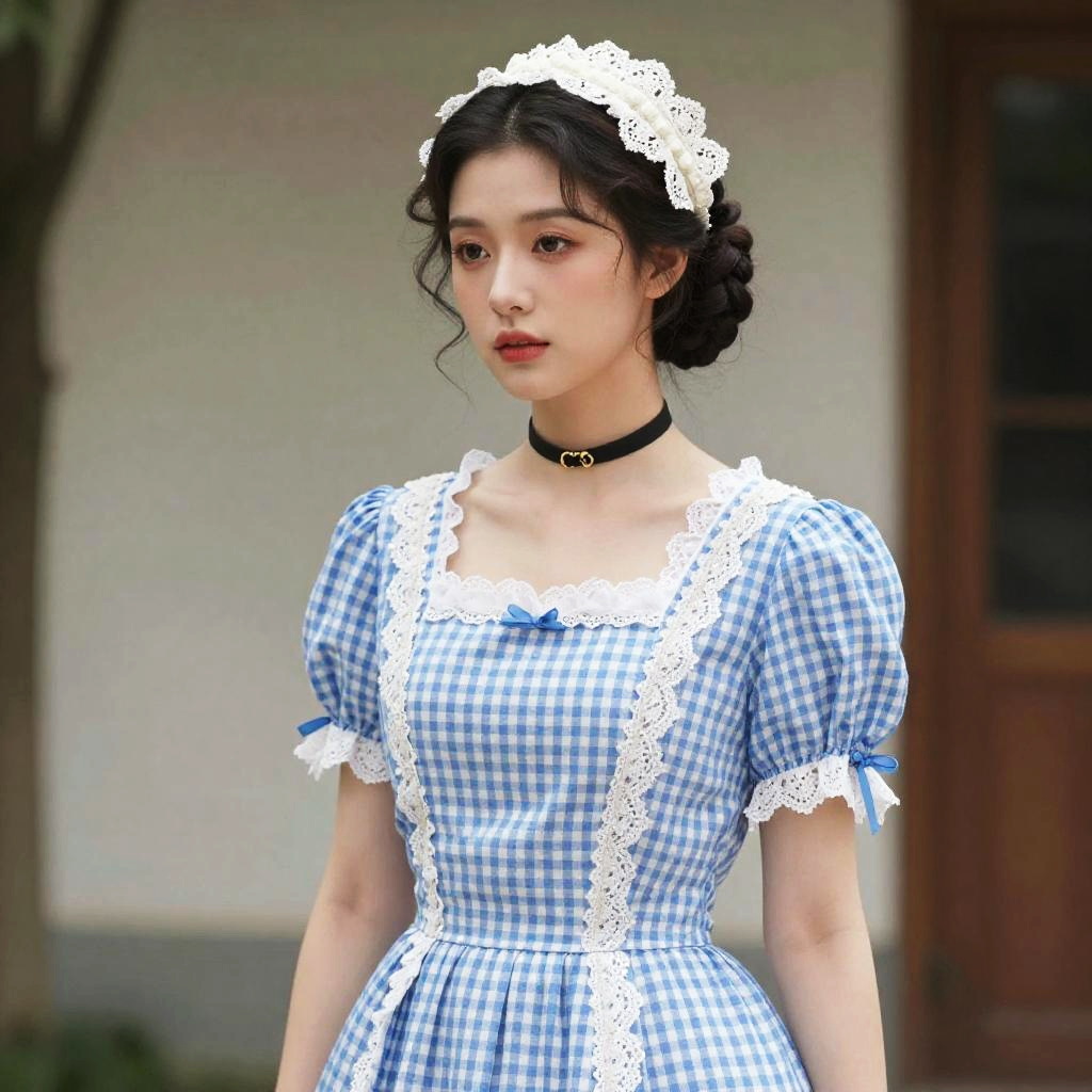 A woman is dressed in a classic Miss Elizabeth costume, featuring a vintage-inspired blue gingham dress with lace trim and puffed sleeves. Her hairstyle and makeup evoke a retro aesthetic, complemented by a lace headpiece and a black choker that enhance the nostalgic look.