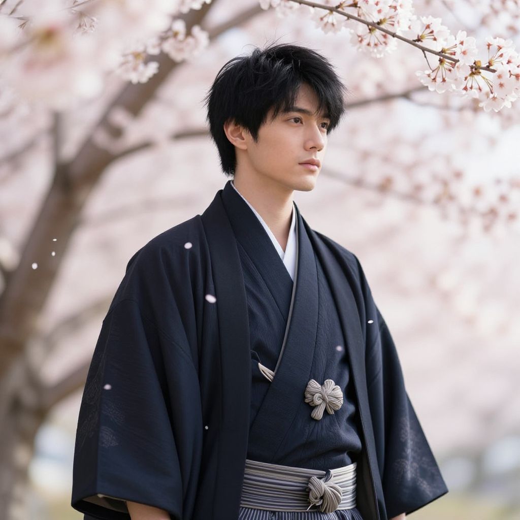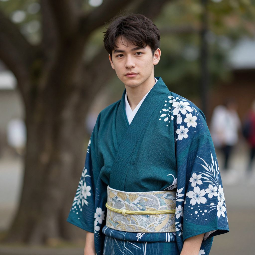 Photograph of a young Asian man standing outdoors. He has short, dark hair and wears a teal kimono adorned with white floral patterns on the sleeves and obi (sash) with intricate gold and white designs. His expression is neutral, and he gazes directly at the camera. The background is slightly blurred, featuring a large tree trunk and indistinct people in white robes. The setting suggests a traditional Japanese environment, with natural light illuminating the scene. The overall composition highlights the cultural attire and serene atmosphere.