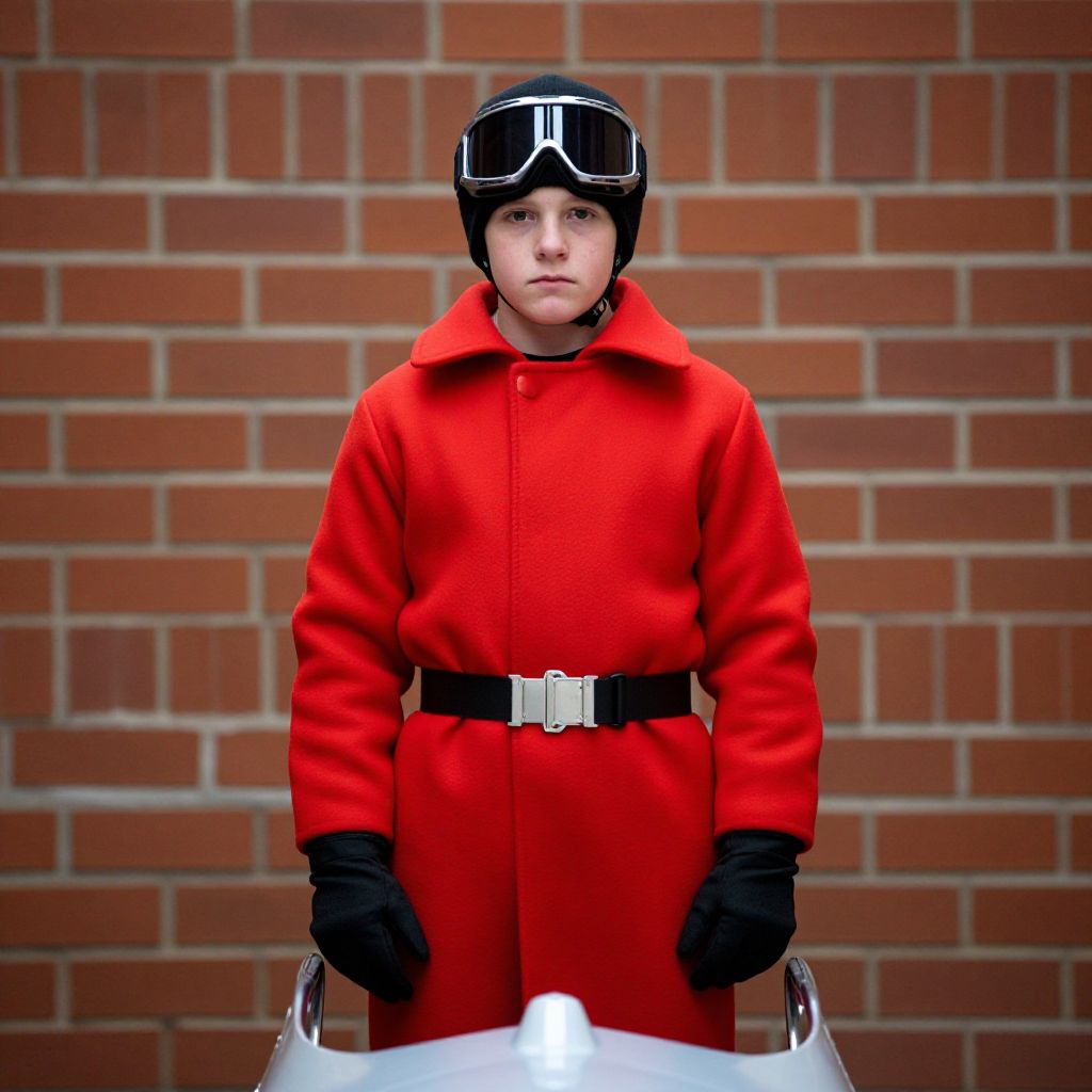 Bobsled costume, 1boy, solo, male focus, goggles, looking at viewer, coat, goggles on head, realistic, belt, closed mouth, gloves, red coat, standing, goggles on headwear, brick wall