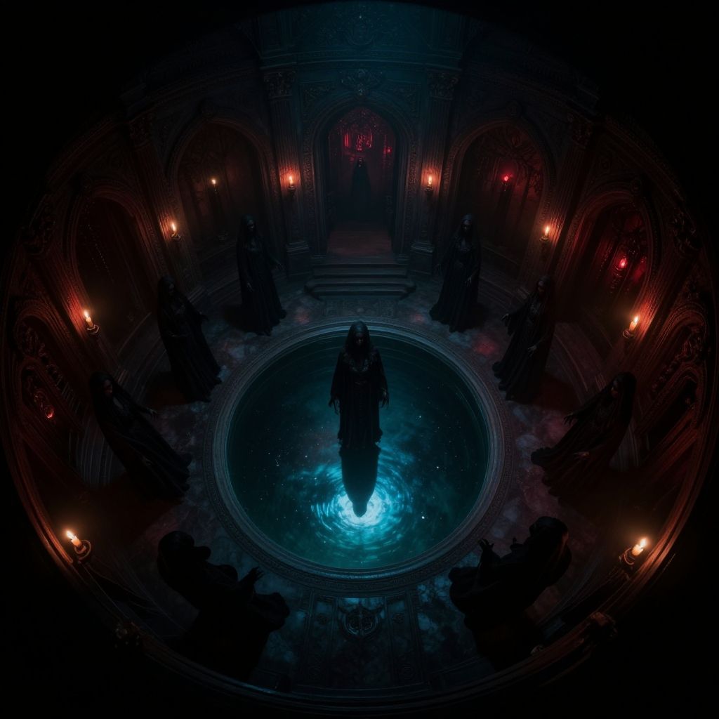 High angle downward looking intense fish-eye lens photograph ((In the harem of the cenobytes, where shadows dance, A labyrinth of desire, a forbidden trance.Veiled figures glide with silent grace, In the echoing halls of this sacred space.Each chamber adorned with intricate design, Glowing with hues of crimson and wine.Candles flicker, casting ethereal light, Illuminating the mysteries of the night.In the center, a pool of liquid obsidian, Reflecting the stars with a mesmerizing radiance.Whispers of incense linger in the air, As the scent of jasmine weaves through despair.The cenobytes, guardians of ancient lore, Hold secrets whispered forevermore.Their eyes, pools of darkness and mystery, Conceal depths of longing and history.In this harem of the divine, time stands still, As the cenobytes surrender to their will.Bound by tradition, yet yearning for release, In the silent embrace of eternal peace)), (horror, dark, terrifying, style of Clive Barker, perfect photograph, Getty images quality photograph), ((uhd, 8k, strong fisheye-lens photograph, fisheye-view, taken with Sony A7R III, 30sec at f/5.6, ISO 20, 000, 12-24mm f/16 aperture at 12mm, experimental angles, cinematic faint blueish-greenish horror lighting, frightening shadows, perfect composition, award winning featured photograph, full-length photograph (entire body photograph)))ng_deepnegative_v1_75t, epiCRealism, Ellis-RealismBoost