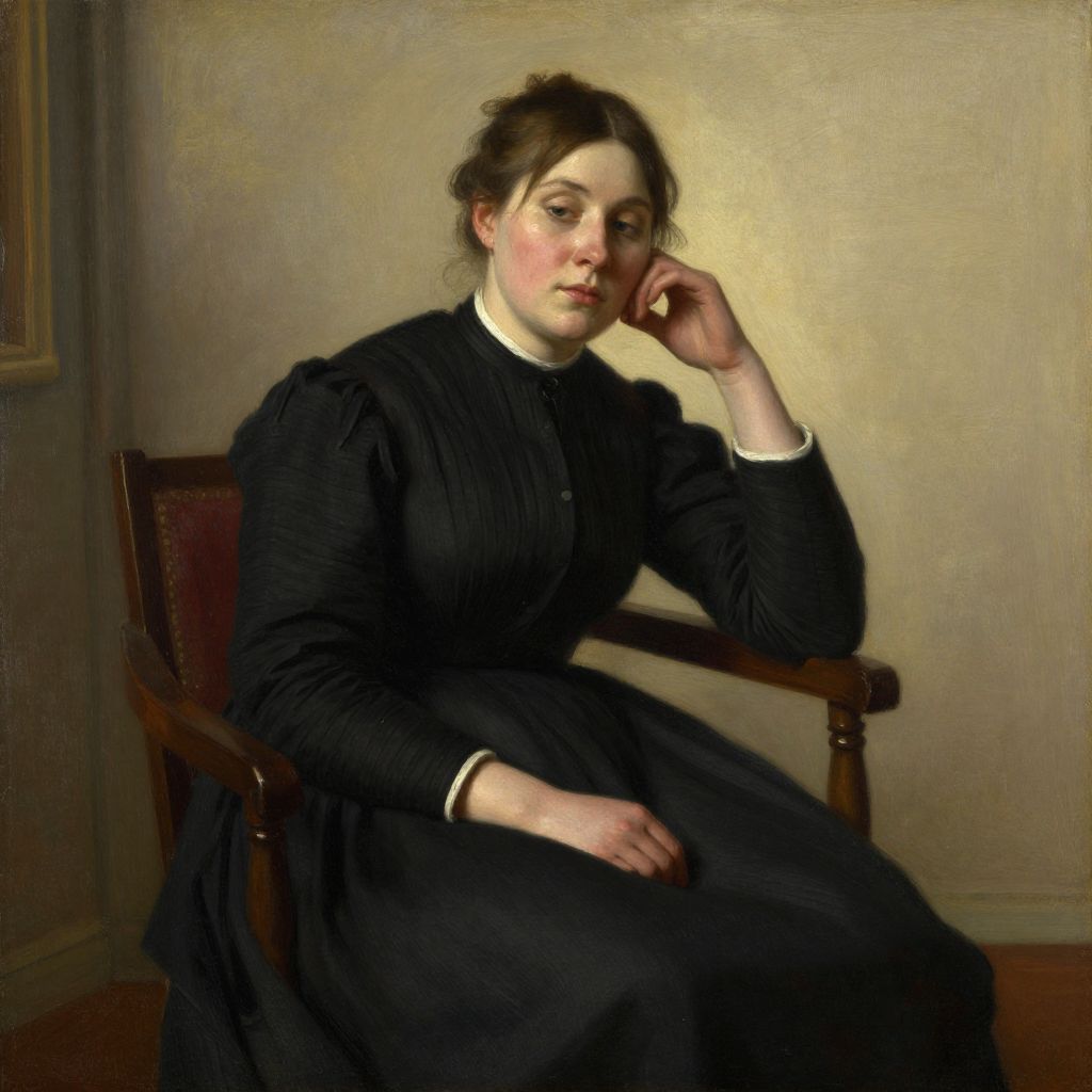 A finely detailed oil painting by Michael Malm, showcasing a serene portrait of a woman in a classic American figurative style, featuring soft, natural lighting and a timeless composition that highlights her elegant attire and poised demeanor.
