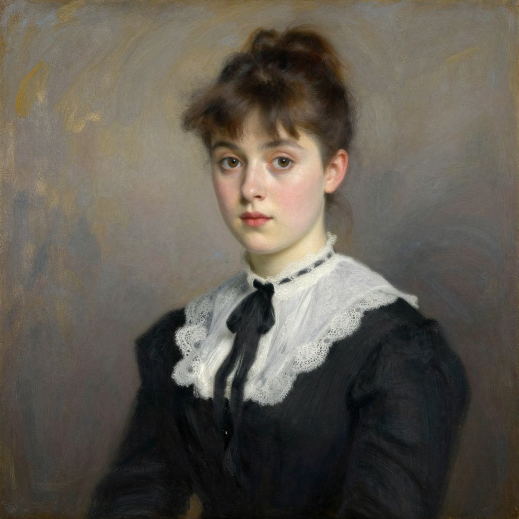 Oil painting of a young woman with fair skin, dark brown hair in a loose bun, wearing a blue buttoned jacket over a white blouse, against