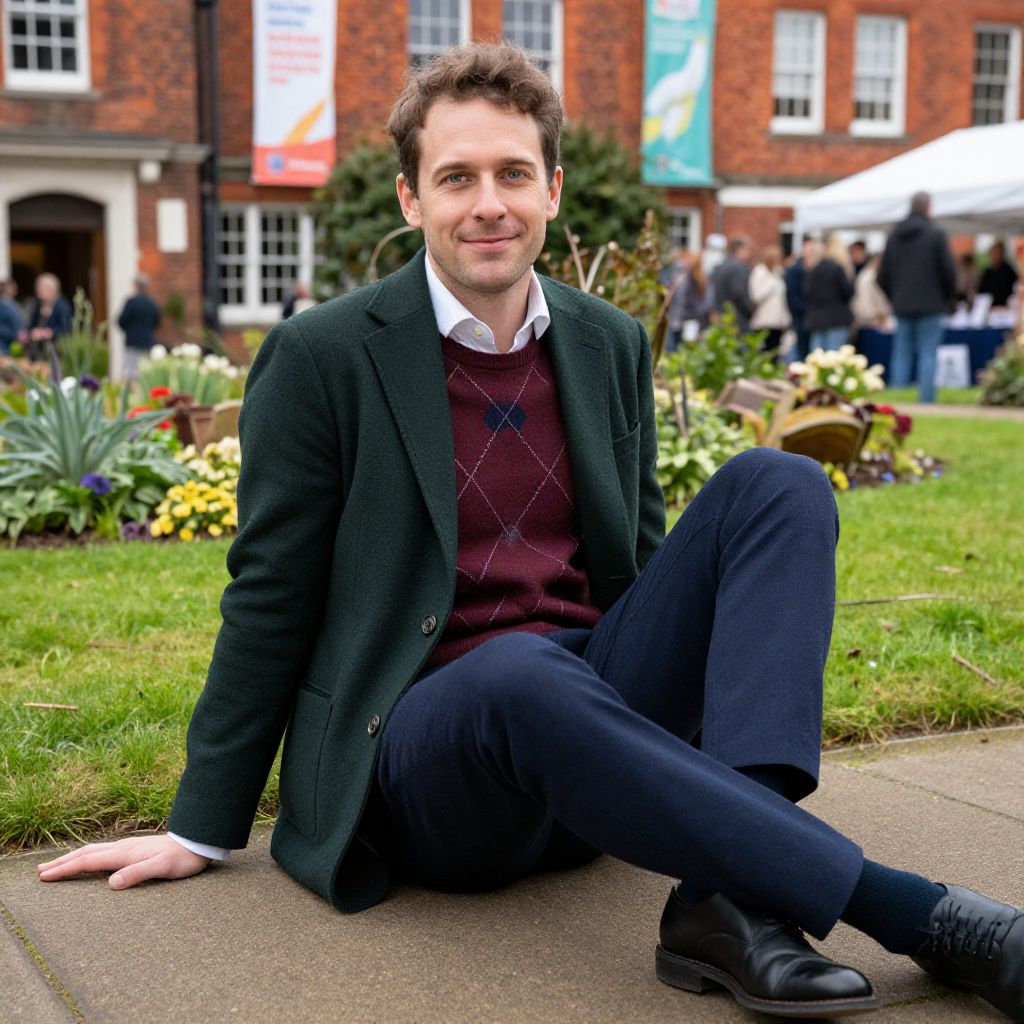A man, dark green blazer, burgundy argyle sweater, navy wool trousers, black leather oxfords, white button-up shirt, historic brick architecture, lush green gardens, community event banners, candid shot, relaxed smile, warm atmosphere.Man has masculine face and piercing eyes