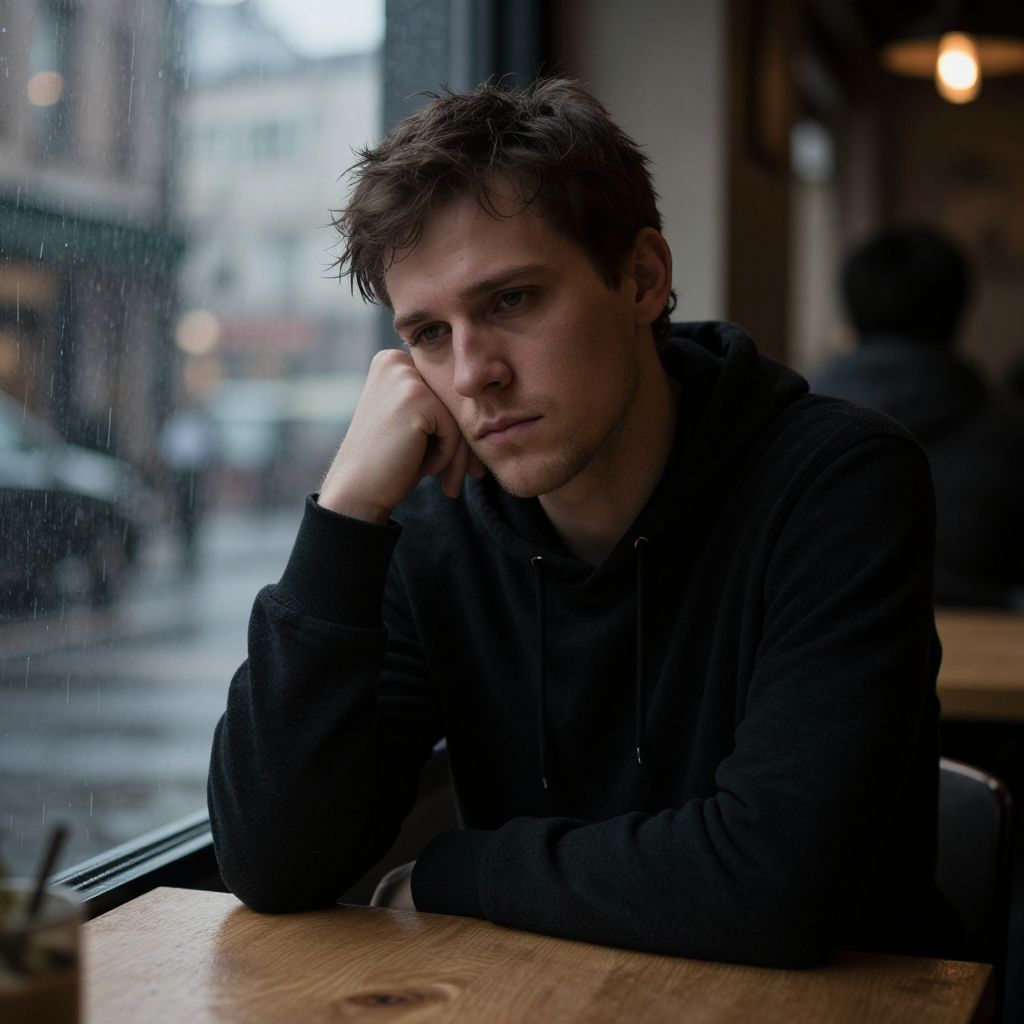 Photograph of a pensive young man with messy brown hair, wearing a black hoodie, resting his head on his hand at a rainy window table in