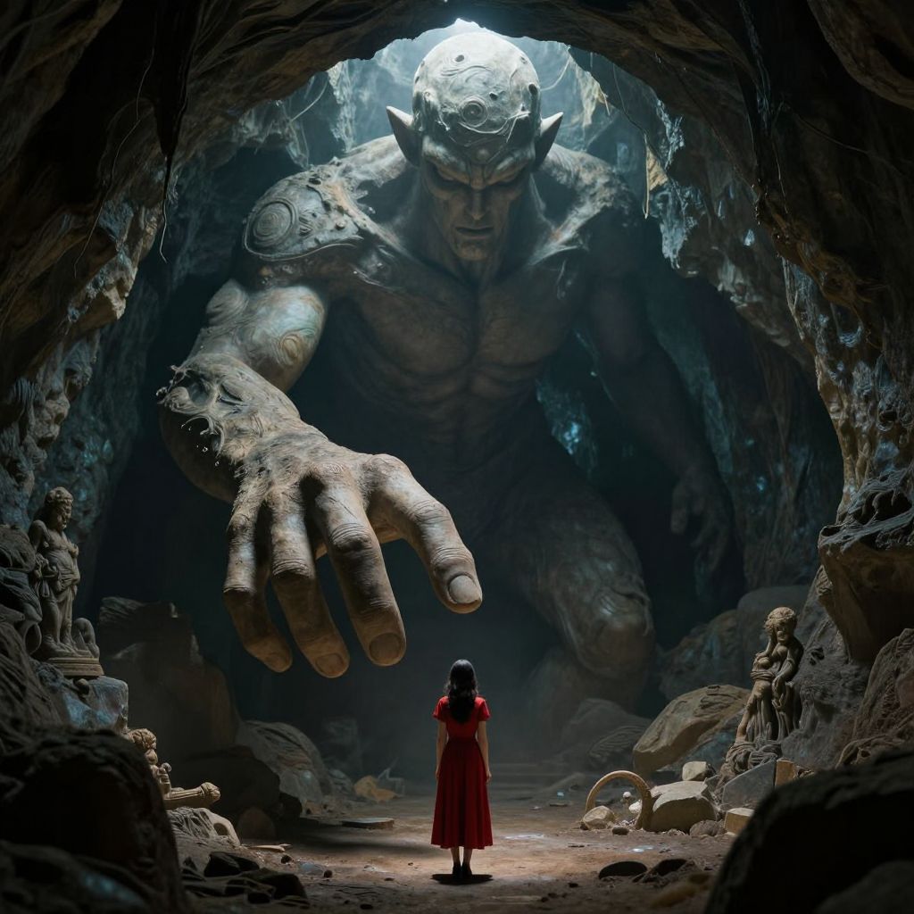 A colossal, humanoid figure emerges from a cavernous tunnel, its massive hand reaching down towards a solitary woman in a red dress who stands below, dwarfed by the surreal scale and eerie atmosphere of the underground setting.