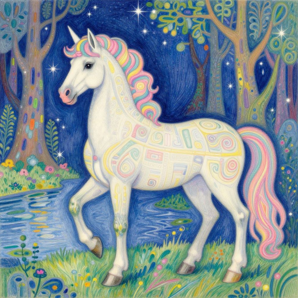Hyper-detailed Neo-Impressionist colored pencil drawing of a unicorn standing in a mystical forest by a river. The mythical creature features intricate stylized patterns on its body, blending elements inspired by Jacek Yerka, Gustav Klimt, and Pierre-Auguste Renoir. The unicorn's mane and tail are elaborately colored in pastel shades with swirling designs, set against a vibrant fantasy background with sparkling stars and stylized trees.