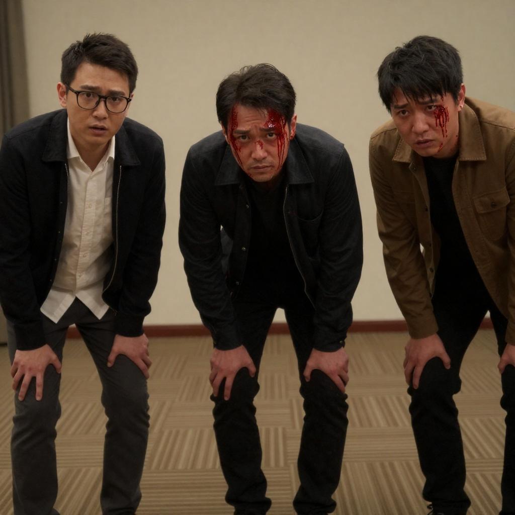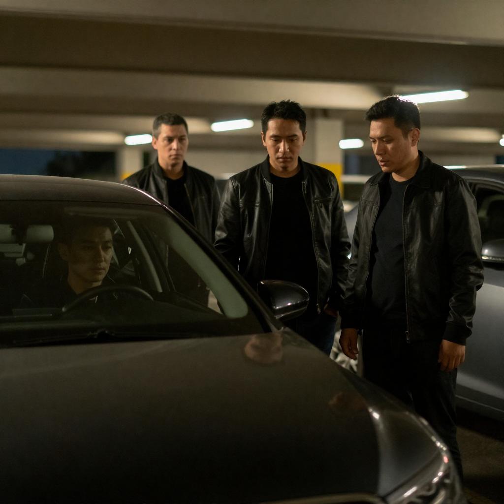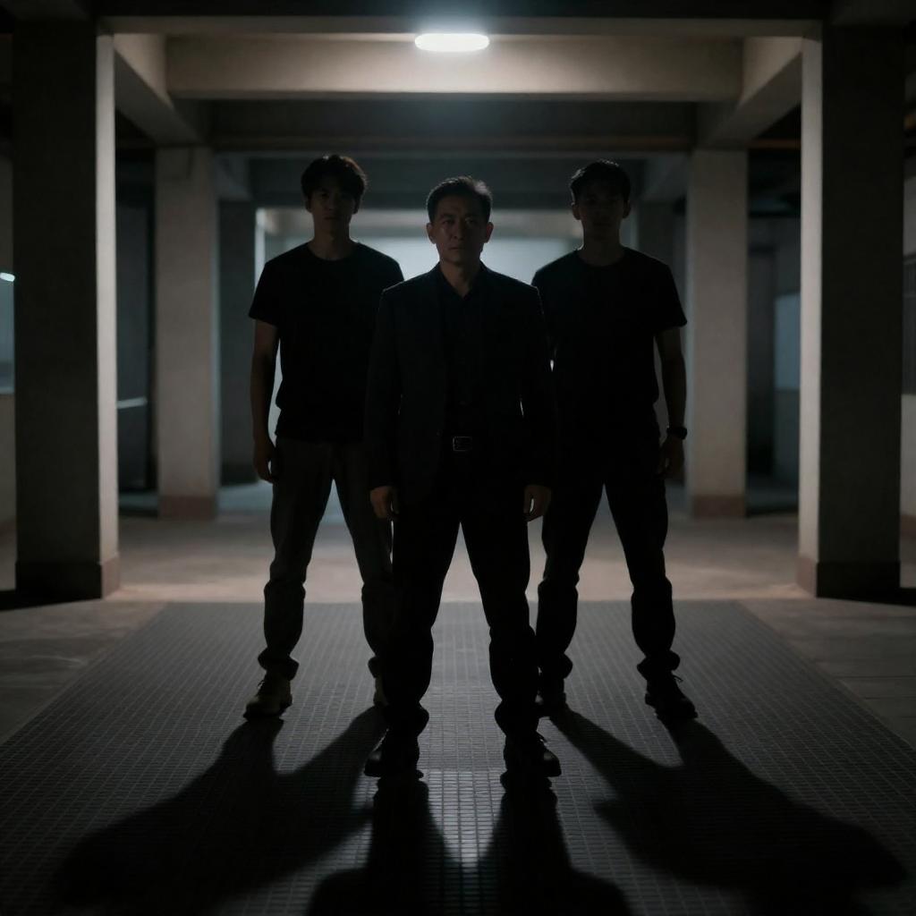 Silhouetted photograph of three men in a dimly lit, industrial hallway. Center figure in a suit, shorter, middle-aged. Left and right figures in casual clothes, taller, muscular. Bright overhead light creates strong shadows. Metal grate floor. Columns flanking the scene.