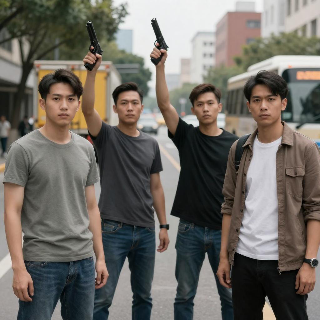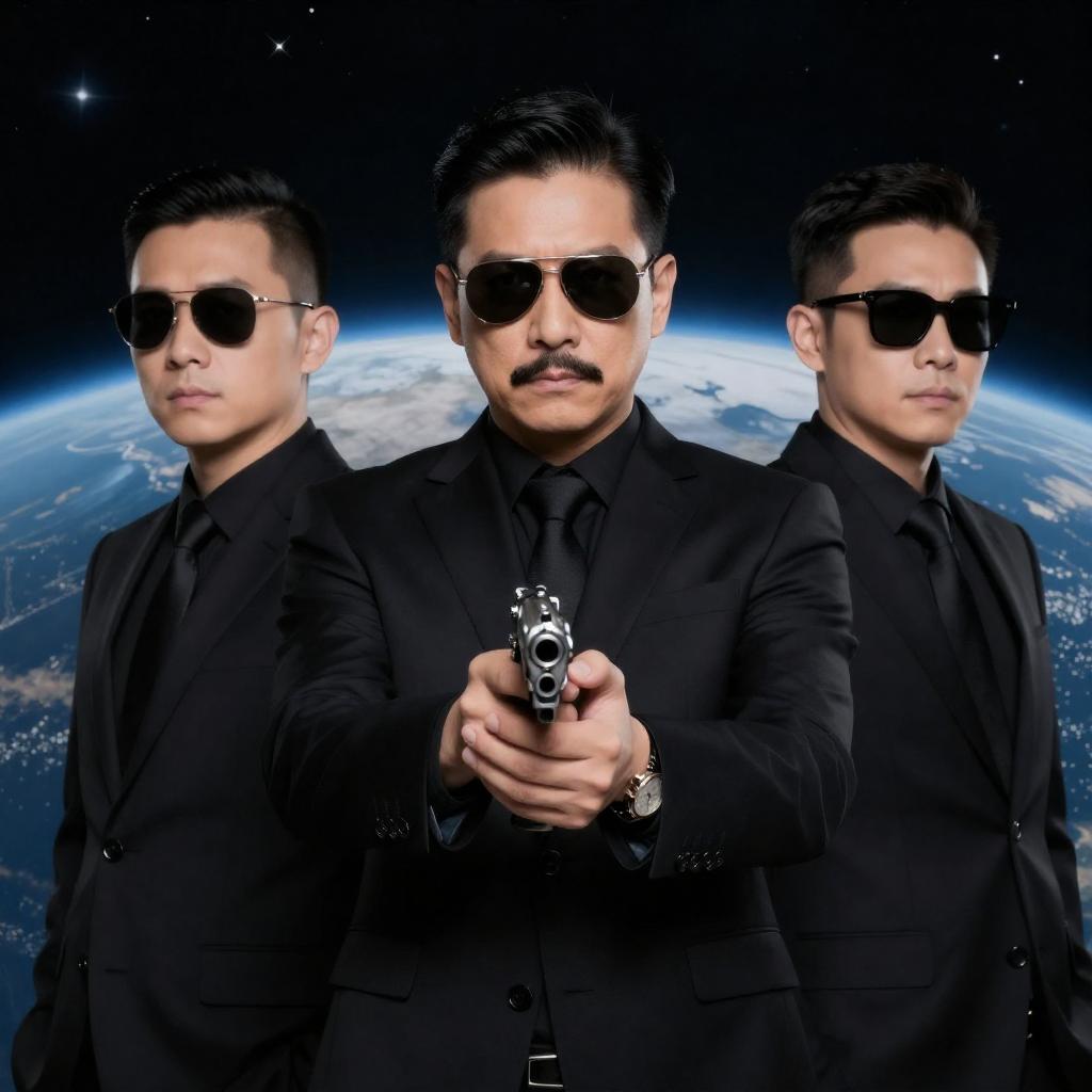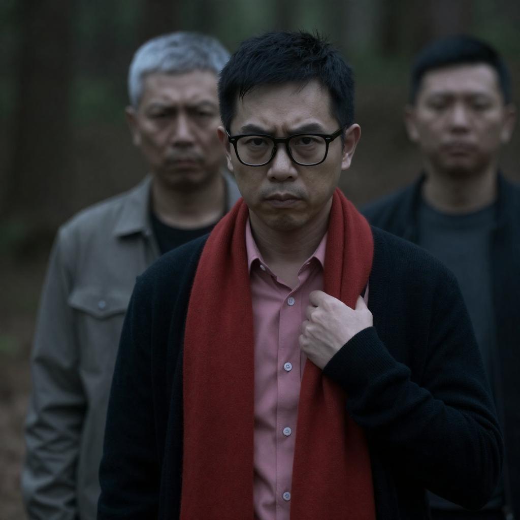 Silhouetted photograph of three men in a dimly lit, industrial hallway. Center figure in a suit, shorter, middle-aged. Left and right figures in casual clothes, taller, muscular. Bright overhead light creates strong shadows. Metal grate floor. Columns flanking the scene.