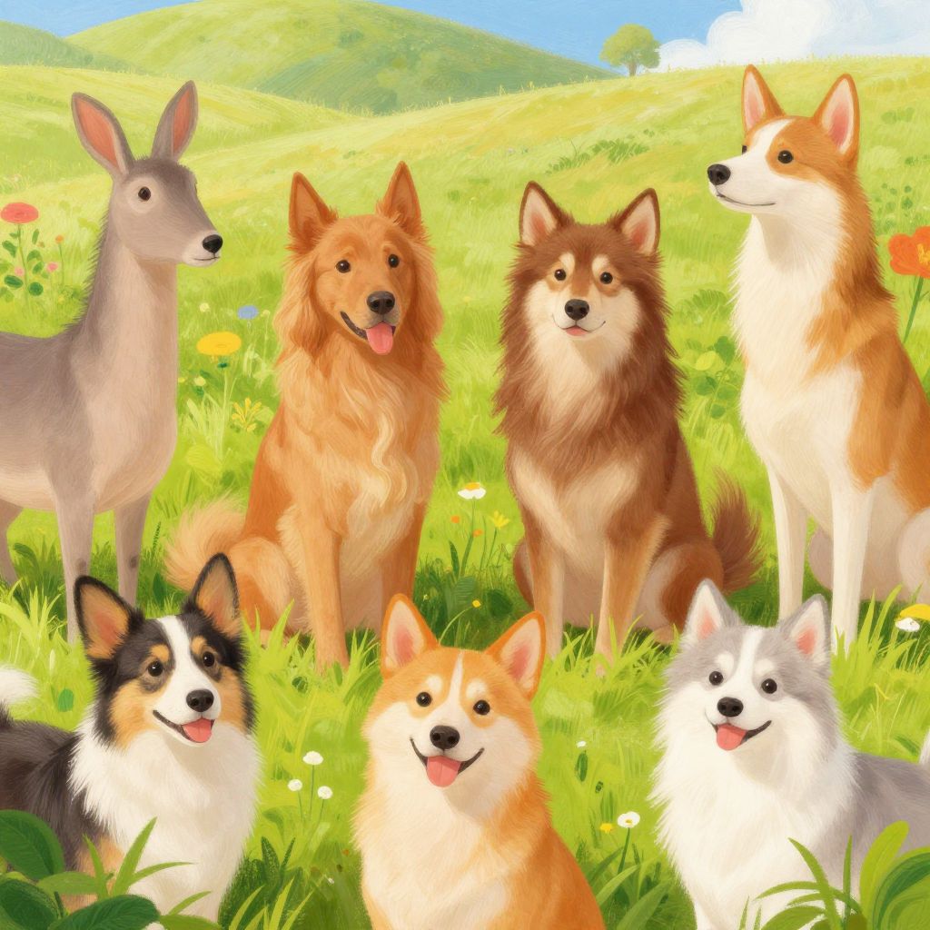 Playful scene of various animals with human faces in a vibrant meadow, bright and cheerful colors, detailed expressions showing personality, painterly aesthetic with soft brush strokes