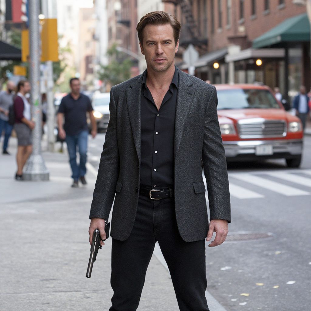 Photograph of a tall, attractive Caucasian man with short, brown hair and a stern expression. He wears a dark gray, textured blazer over a black button-up shirt, paired with black pants and a black belt. He holds a black handgun in his right hand. The background features a bustling urban street with blurred pedestrians, a red truck, and brick buildings. The street is lined with green awnings and yellow traffic signs. The lighting suggests daytime with soft, natural light. The man's confident stance and serious demeanor convey a sense of readiness or determination.