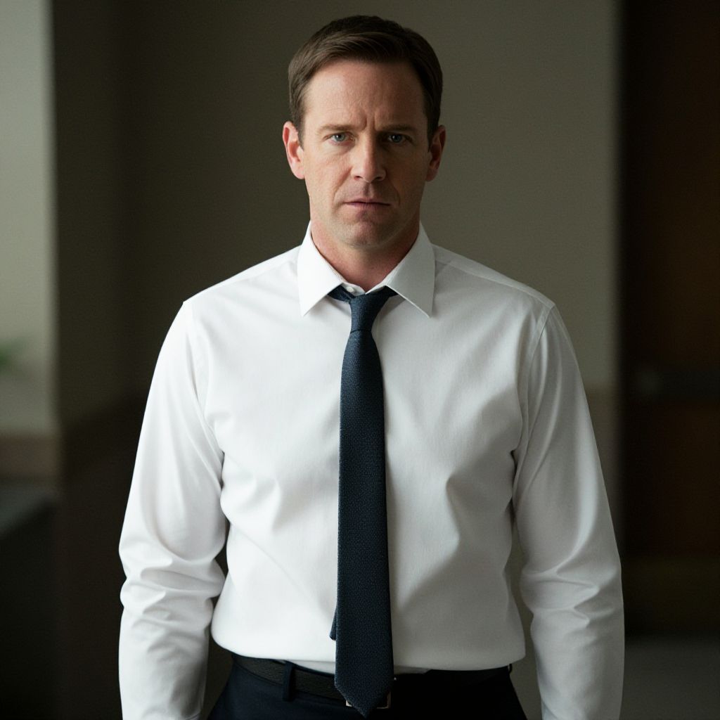 Photograph of a serious, handsome man with short brown hair, wearing a black dress shirt and gray checkered blazer, holding a gun, standing