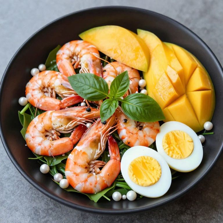 Vibrant Thai Prawn and Mango Salad presented in a black bowl, featuring eight perfectly cooked prawns garnished with fresh basil, surrounded by slices of ripe mango, halved hard-boiled eggs, and scattered pearl onions atop a bed of green leafy vegetables.