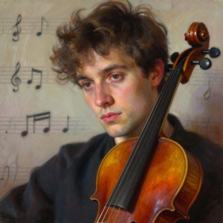 Photorealistic painting of a young, curly-haired man with fair skin, holding a violin against a musical notation background. He wears a dark jacket,