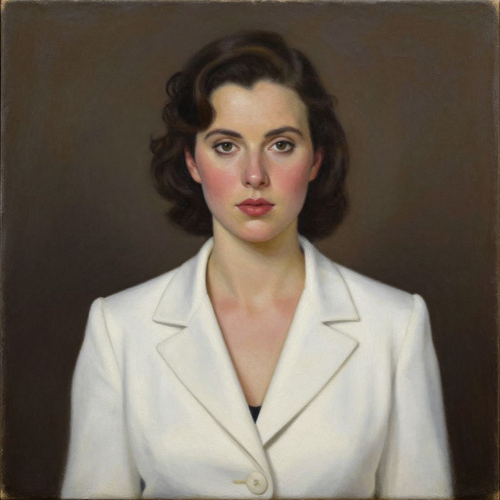 Photorealistic digital painting of a serious woman with short, wavy dark brown hair, wearing a white blazer, against a dark background.