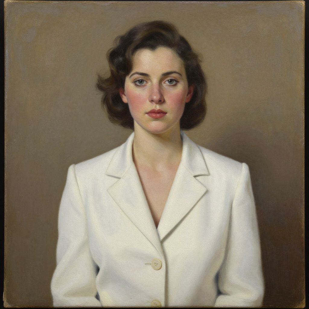 This digital painting portrays a Caucasian woman with fair skin and dark, wavy, shoulder-length hair. She has a serious expression with slightly pink lips and dark, almond-shaped eyes. She wears a white, tailored blazer with a pointed collar over a black top. The background is a solid, dark brown, making her white blazer stand out prominently. The painting has a realistic style with smooth, detailed textures and subtle shading, emphasizing her facial features and the fabric of her blazer. The overall composition is centered, focusing on her upper body.