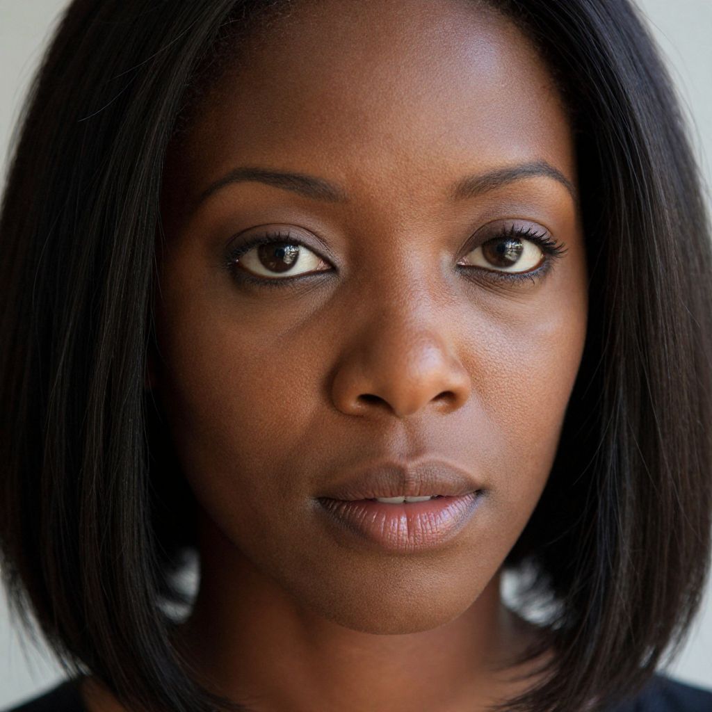Close-up photograph of a young Black woman with smooth dark brown skin, straight black shoulder-length hair, and neutral expression, wearing subtle makeup and a black