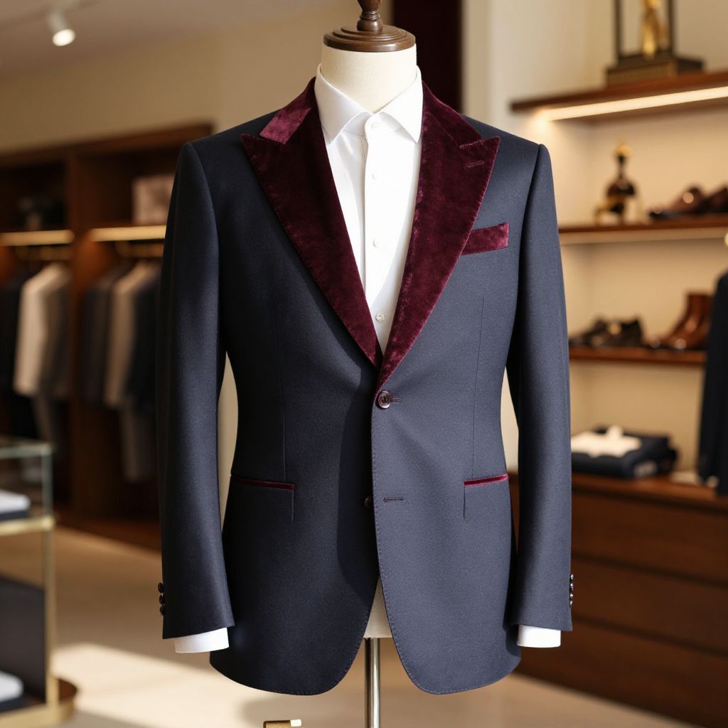 A high-end suit prompt for men designed to emphasize luxury fabric and craftsmanship, with a rich velvet lapel and contrast pocket details, placed in a sunlit interior of a boutique clothing store with elegant product displays.