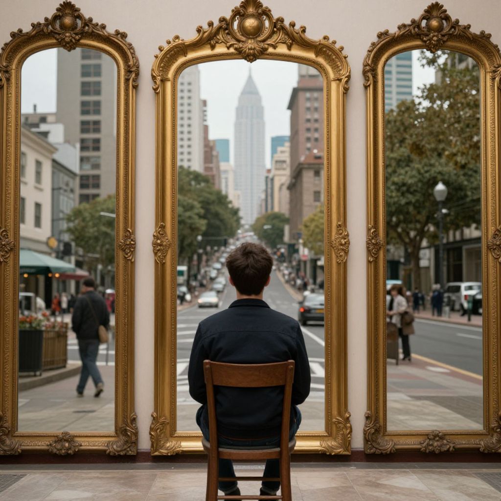 A man sits in a wooden chair facing a series of ornate gold-framed mirrors that reflect multiple parallel worlds, each depicting distinct urban landscapes and outdoor scenes, creating an illusion of infinite possibilities.