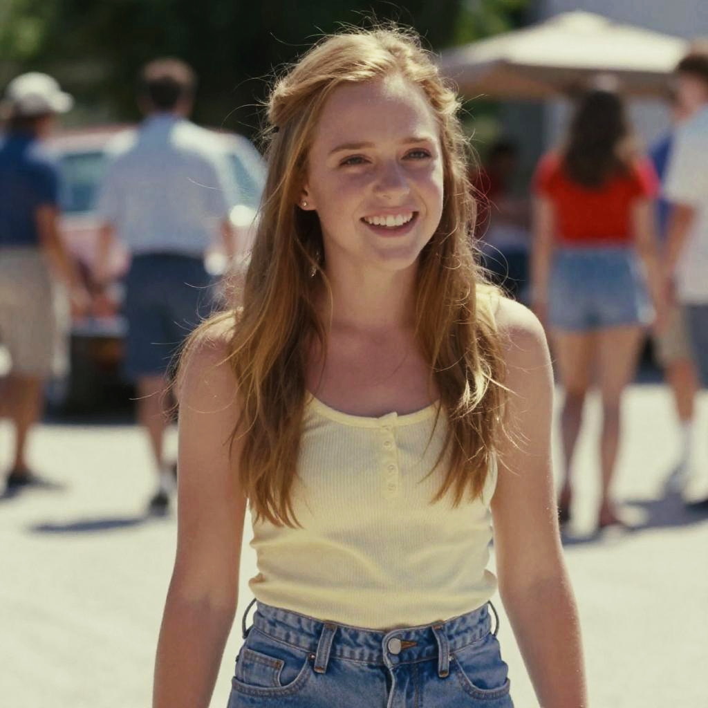 Lindsay Lohan younger years in early acting days, wearing casual youthful clothes, outdoor summer scene, nostalgic 90s vibe, bright colors, candid smile, film grain effect