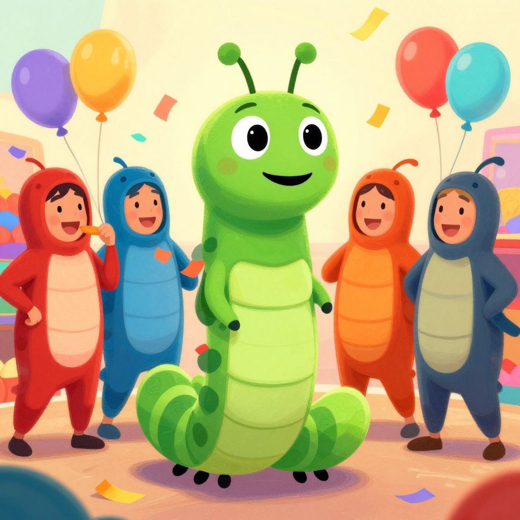 Colorful cartoon image of five children in insect-themed costumes standing around a large green caterpillar mascot with balloons and confetti.