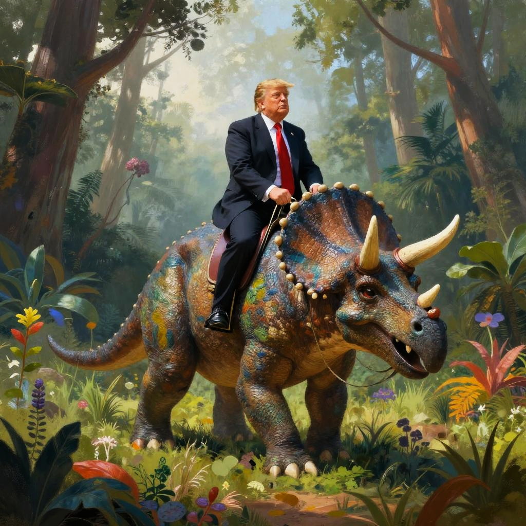 Trump riding a triceratops through a lush prehistoric forest, colorful flora, mist in the background, majestic and powerful pose, whimsical and surreal style, painterly brush strokes, vibrant and detailed environment