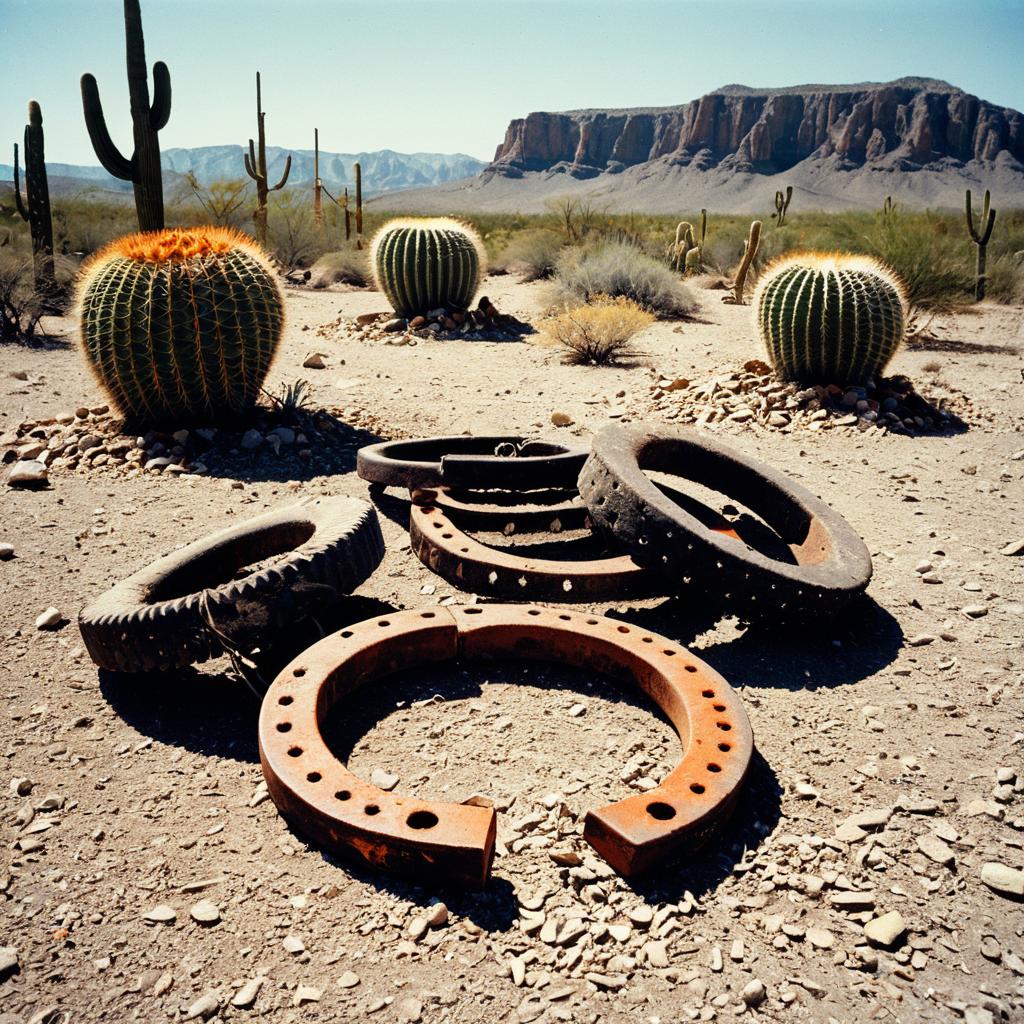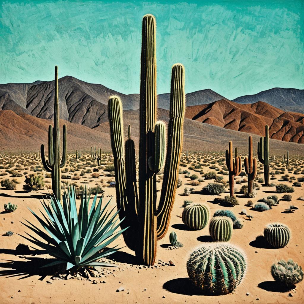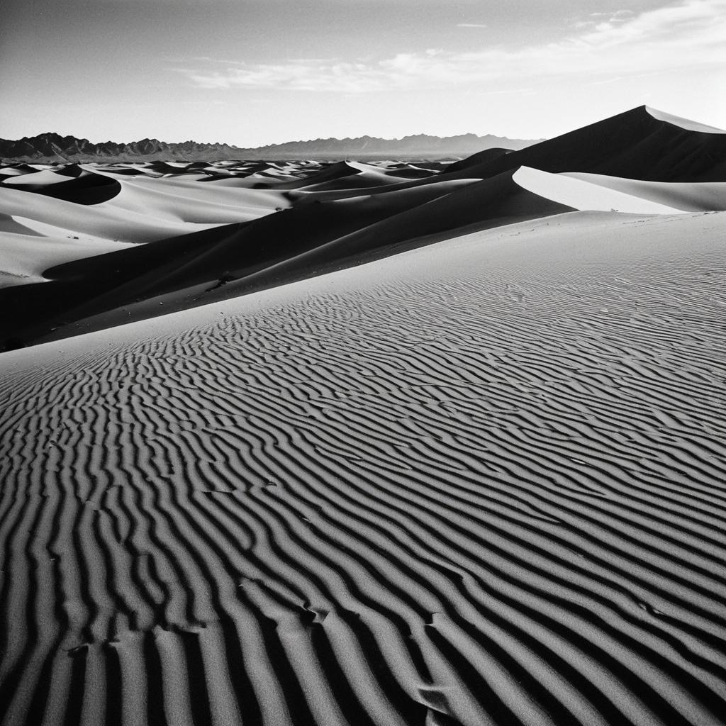 Desert with sand dunes at noon under a clear sky featuring a solitary cactus and distant mountains