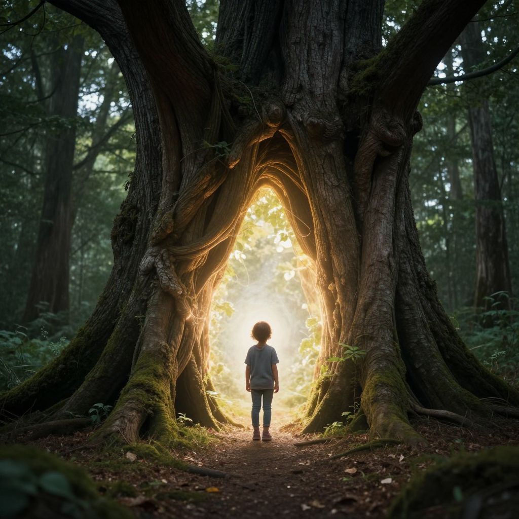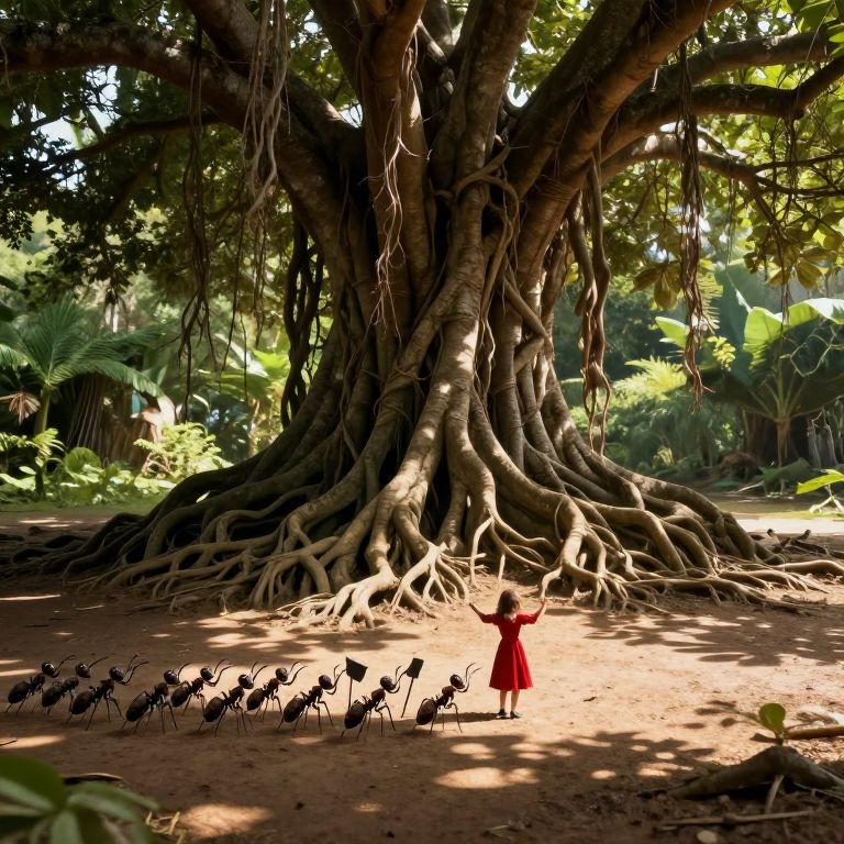A colossal tree with cascading roots forms a natural amphitheater where a tiny figure in a red dress conducts an orchestra of ants marching in perfect harmony across the sunlit earth.