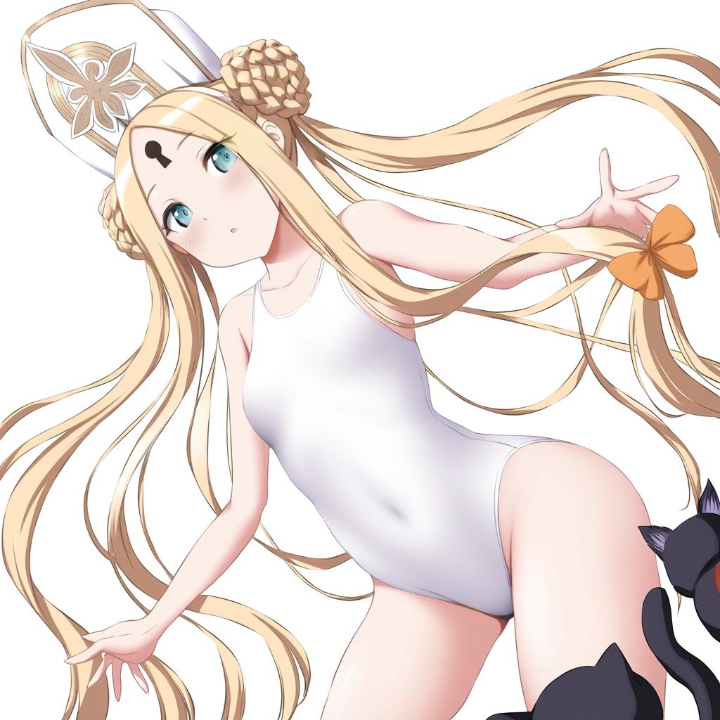 Abigail williams (swimsuit foreigner) (second ascension) (fate), fate/grand order, 1girl, blue eyes, blonde hair, very long hair, parted bangs, sidelocks, double bun, twintails, braided bun, small breasts, thighs, covered navel, white one-piece swimsuit, dress swimsuit, white headwear, bare shoulders, orange bow, black bow, multiple bows, forehead, black cat, keyhole, mitre, white hat, by artist nori tamago, leet