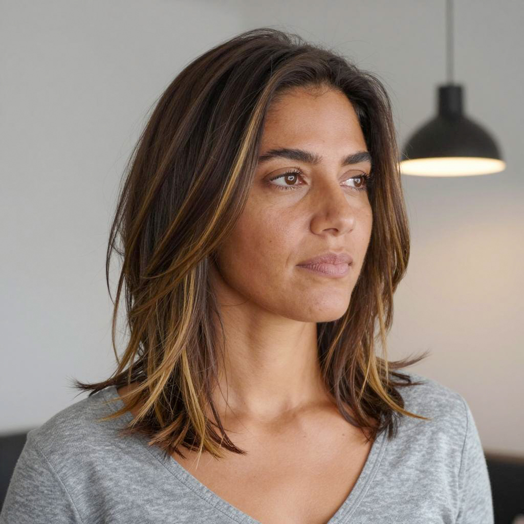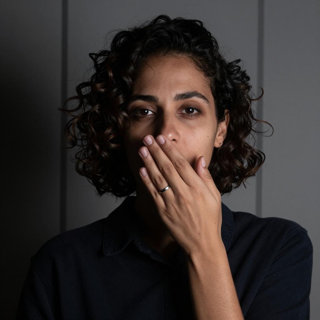 Dark photograph of a woman with short curly hair, covering her mouth with her left hand, wearing a dark shirt, ring on her left ring finger. Her eyes are partially open, looking forward. Shadowed background with vertical lines.