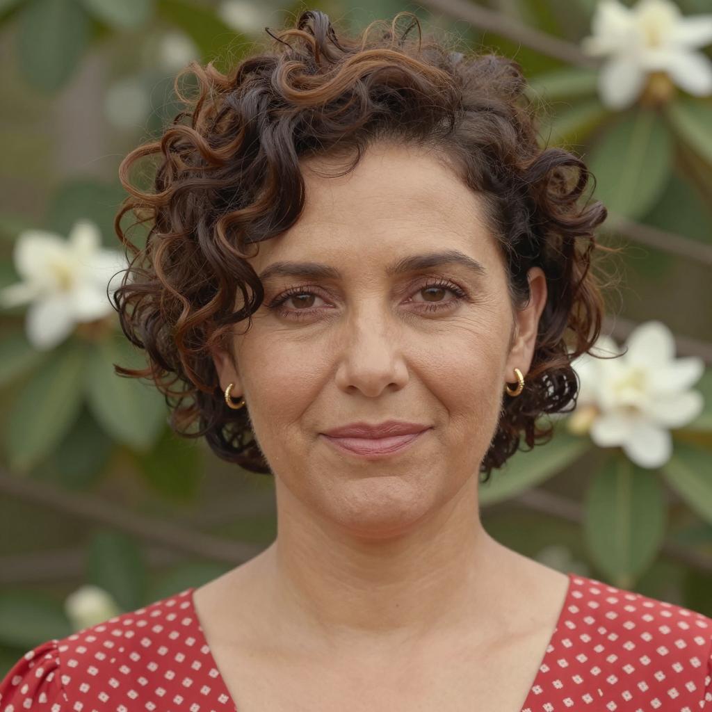 Portrait of a woman with short curly hair wearing a dark shirt, covering her mouth with her left hand. She has a silver ring on her left ring finger. The background is shadowed with subtle vertical lines, and the lighting highlights her face and hand while casting soft shadows.