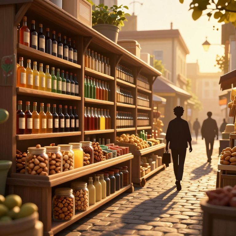 An atmospheric 3D-rendered marketplace bathed in golden-hour lighting, featuring shelves lined with bottles of various hues and jars filled with nuts, evoking a vintage charm as silhouetted figures stroll along cobblestone streets, blending realism with a touch of surreal whimsy.