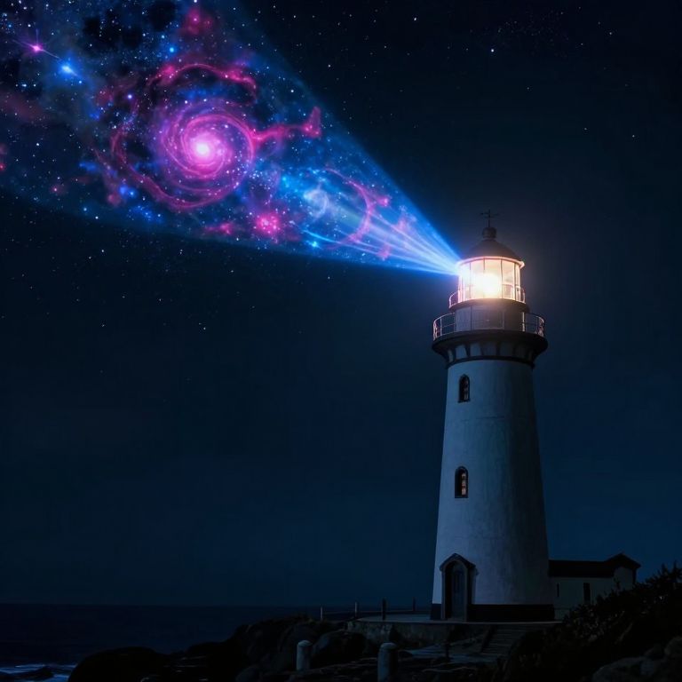 A cyberpunk-inspired digital artwork depicts a lighthouse casting a holographic beam of cosmic light into the night sky, transforming maritime myths into vivid, otherworldly stories that captivate sailors' imaginations.