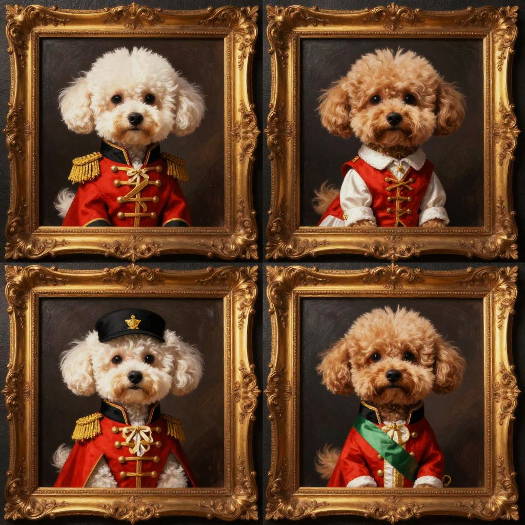 Photograph of four framed portraits of a fluffy white and brown poodle in regal military and naval attire, each in ornate gold frames.