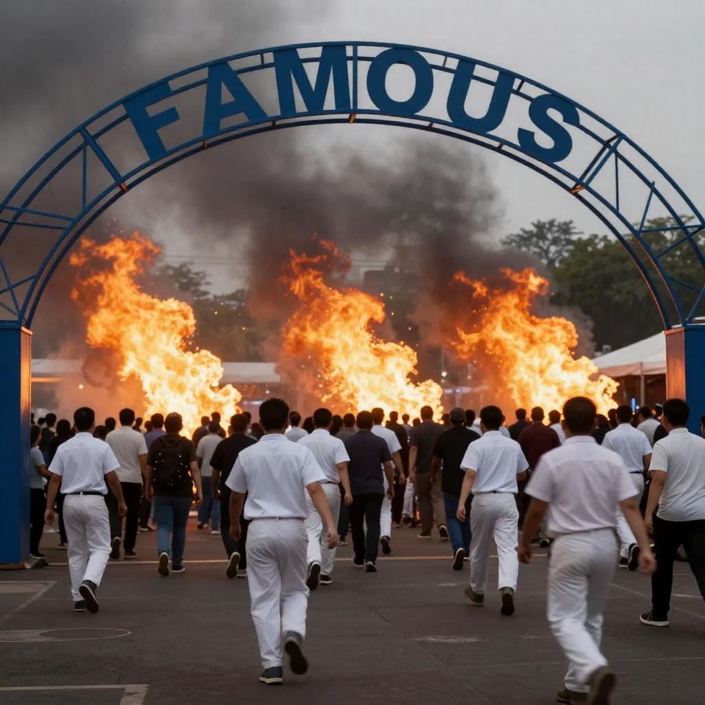 Photograph of a chaotic scene with a large, blue, curved metal archway labeled "FAMOUS" in bold letters. A crowd of people, some in white uniforms, rushes across a dark, ured ground. Bright orange and yellow flames erupt in the background, creating a dramatic contrast with the blue archway.