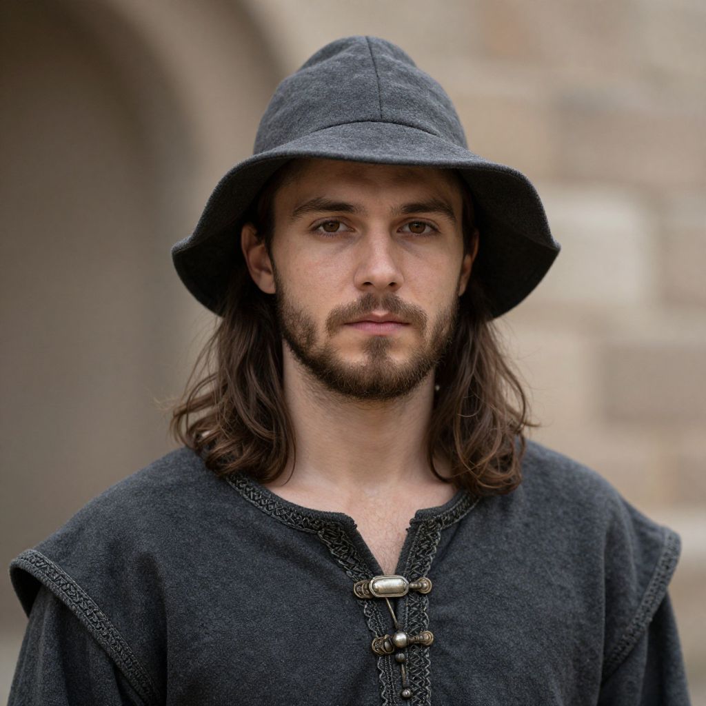 Photograph of a young Caucasian man with long brown hair and a beard, wearing a black, textured, medieval-style tunic with a rounded neckline and metal clasps. He has a solemn expression and is wearing a matching black, wide-brimmed hat that casts a shadow over his face. The background is blurred, showing a stone wall with a large, dark archway. The overall color palette is muted, with earthy tones dominating the scene. The man's attire and expression suggest a historical or fantasy setting.