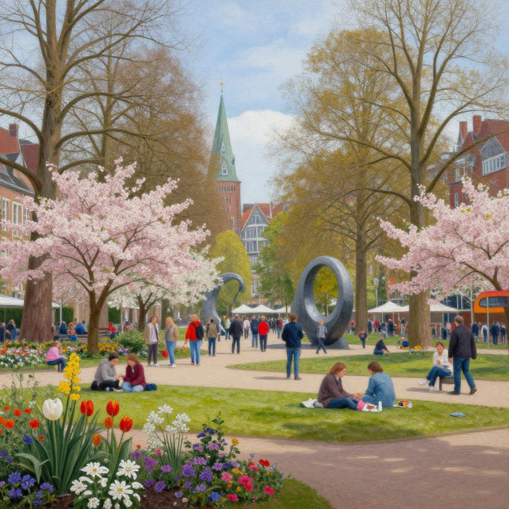 Bremen urban park in spring, blooming flowers and towering trees, people enjoying outdoor activities, modern sculptures harmoniously integrated, bright and cheerful mood with natural sunlight, detailed and realistic landscape painting
