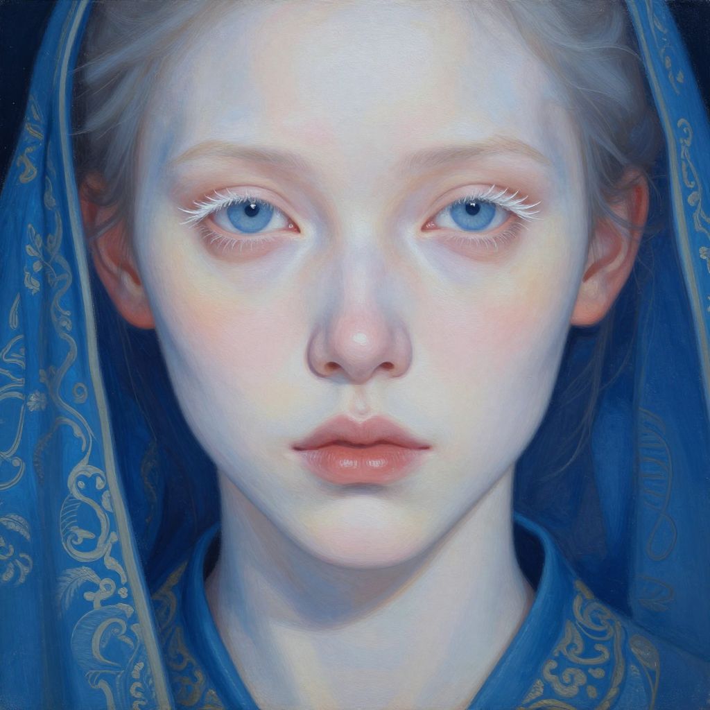 A surreal, photorealistic painting of a pale-skinned woman with striking blue eyes and white eyelashes, wearing a blue garment with intricate patterns.