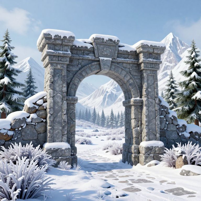 A 3D-rendered fantasy landscape features a majestic stone archway carved into a snow-covered mountain, leading to a serene meadow adorned with frosty shrubs and evergreen trees, evoking a sense of timeless wonder and magical stillness.