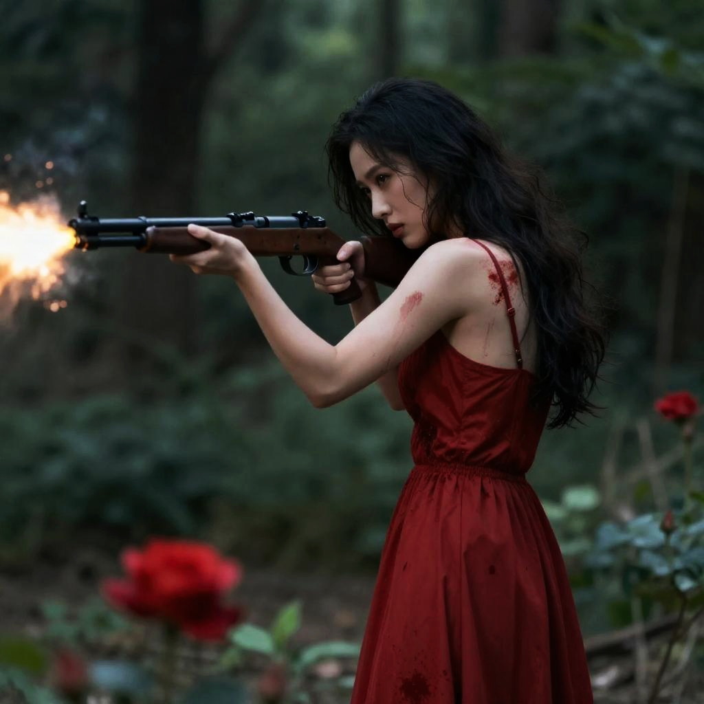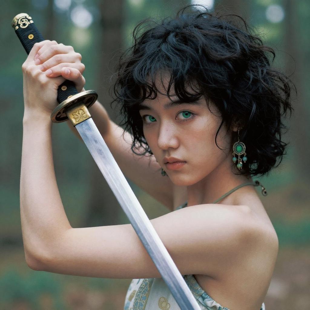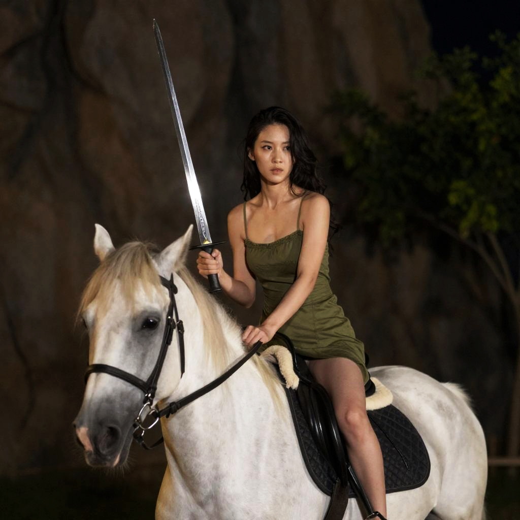 Woman with dark hair and green dress riding white horse, holding sword upright. Rocky background, green bush on right. Intense expression. Nighttime setting, warm light. One person, white horse.
