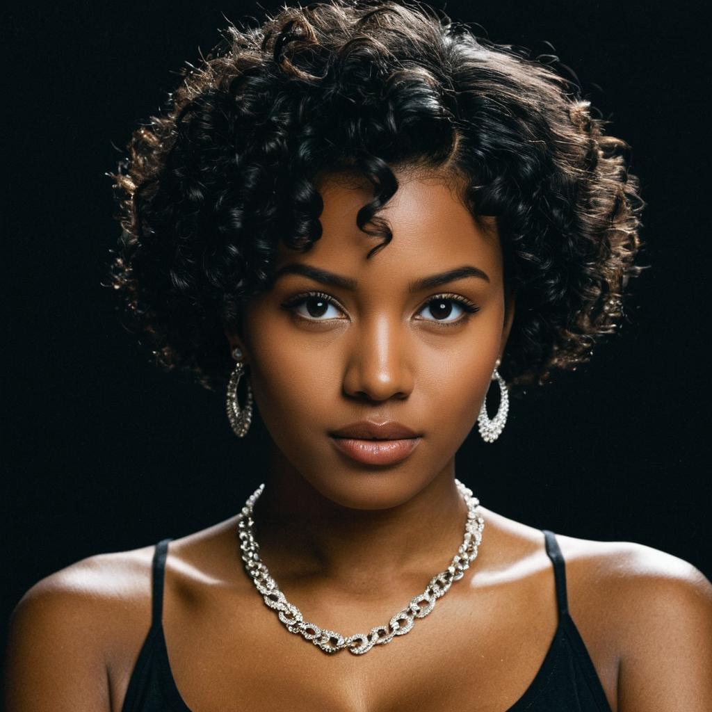 Natural hairstyle short hair,1girl, solo, jewelry, necklace, breasts, earrings, realistic, dark skin, bare shoulders, dark-skinned female, dress, cleavage, lips, medium breasts, black hair, looking at viewer, upper body, brown background
